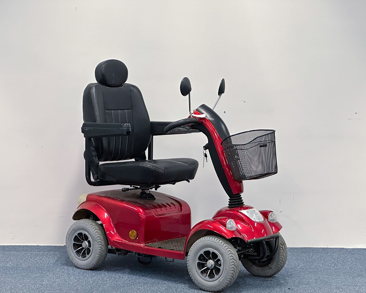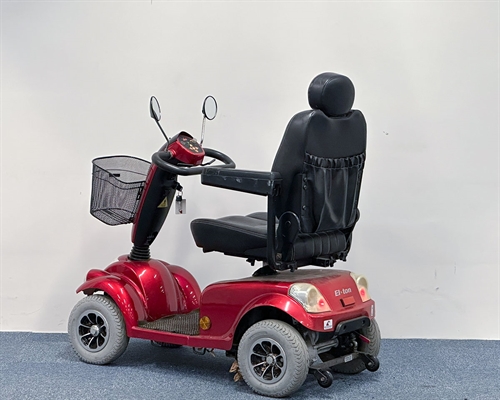 Rød 4-hjulet scooter udstyret med forkurv, så du nemt kan have ekstra bagage med på turen. Denne scooter er god til både de korte og de lange ture - god til bykørsel eller længere ture ude i det fri. Med den kraftige motor og det komfortable sæde, får du en køreoplevelse, som er helt i top.