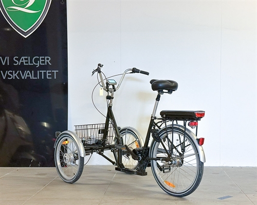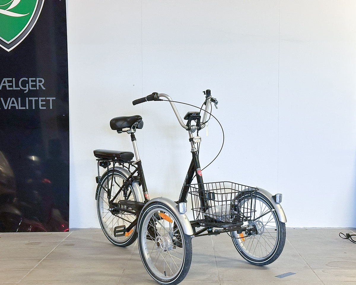 Næsten ny FL-7 seniorcykel. Cyklen er udstyret med affjedring i sadelpinden og en praktisk forkurv til ekstra bagage. Dertil er cyklen monteret med et sæt punkterhæmmende dæk. Cyklen er god og stabil og du vil opleve glæden ved at få vind og håret samt hurtigt og ubesværet at komme fra A til B.