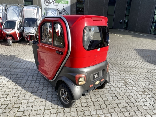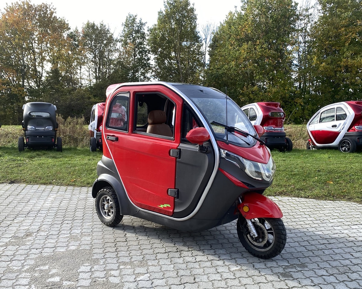 Velkørende brugt kabinescooter i en rød og sort farve. Scooteren fragter dig nemt fra A til B og du kan med en kabinescooter køre hele året i ly for vind og vejr.