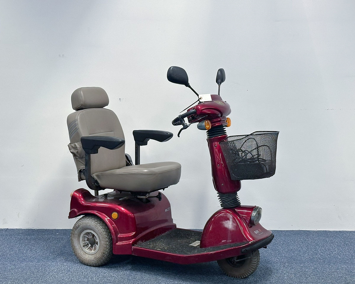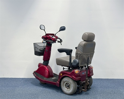 Brugt 3-hjulet el-scooter i en flot rød farve. Sædet er udstyret med justerbare armlæn og nakkestøtte, så køreturen er dejligt behagelig. Scooteren er nem at betjene og meget manøvredygtig - så du kommer let omkring i byen eller på landevejen.