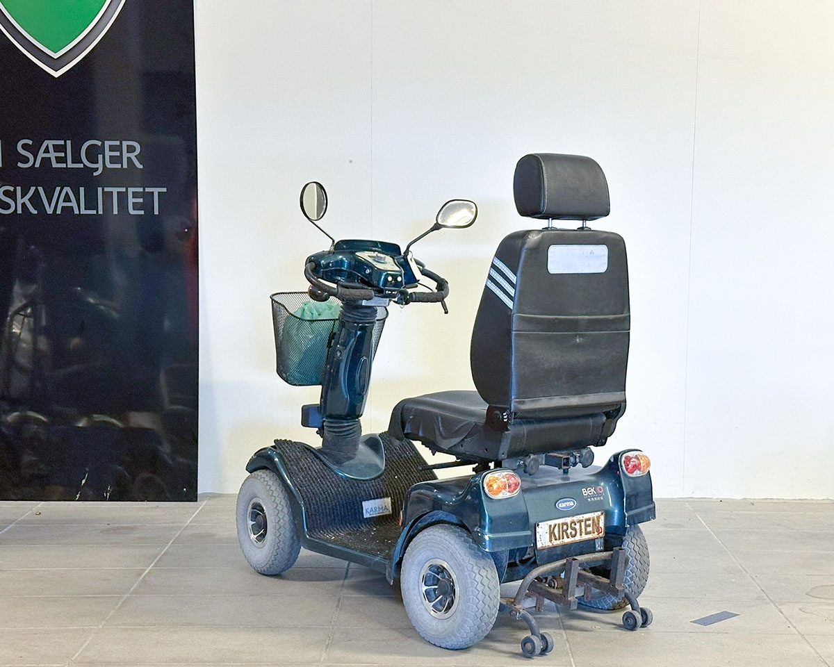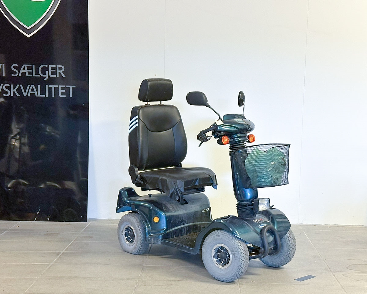 Brugt 4-hjulet el-scooter i en flot grøn farve. Sædet er udstyret med justerbare armlæn og nakkestøtte, så køreturen er dejligt behagelig. Scooteren er nem at betjene og fungerer godt til både bykørsel eller kørsel ude i naturen. Desuden er der monteret en lille forkurv til bagage.