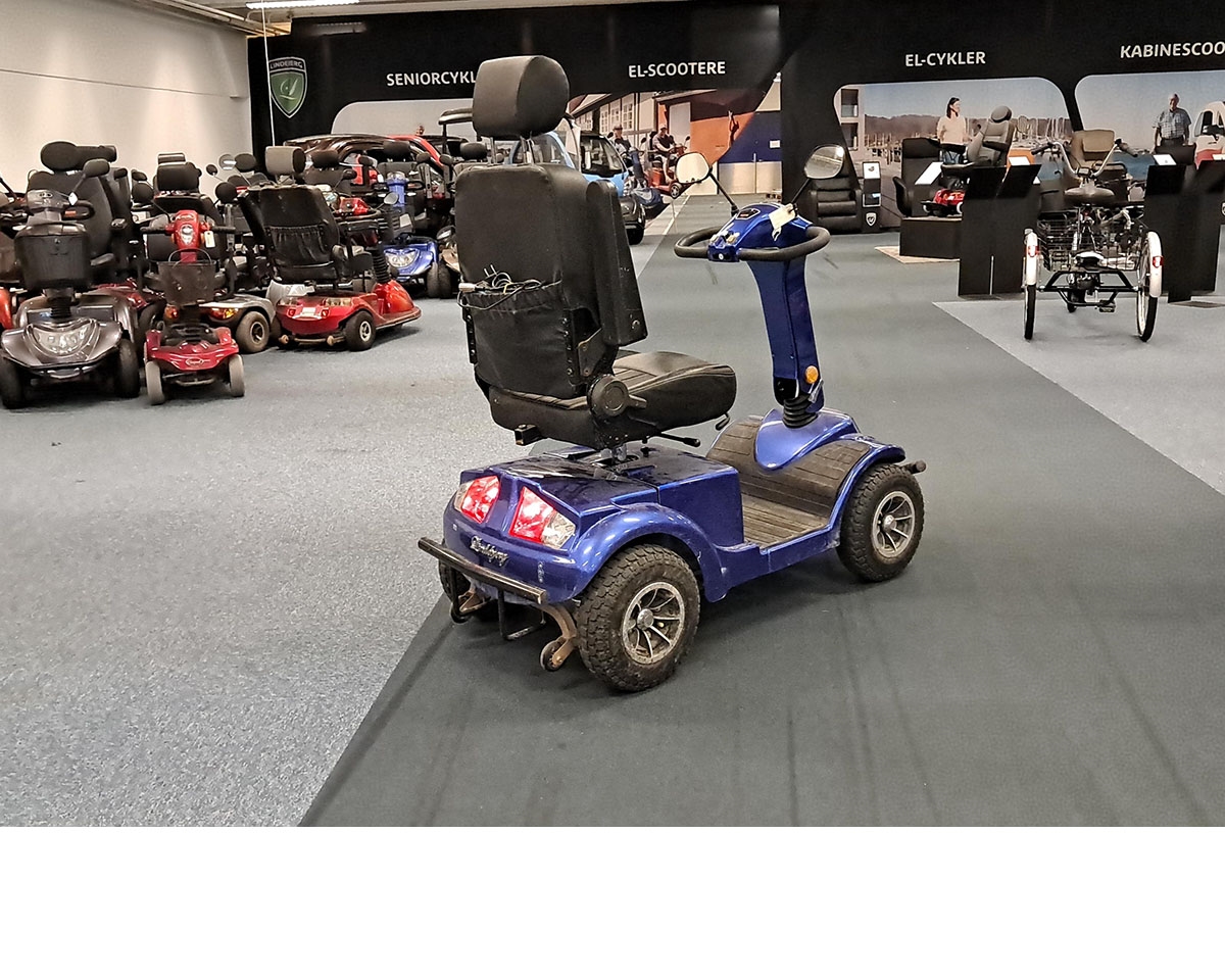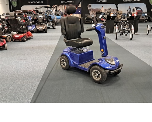 Brugt 4-hjulet scooter i en flot blå farve. De 4 hjul giver en god stabilitet når du kører og sædet er udstyret med justerbare armlæn og nakkestøtte, så køreglæden er helt i top.