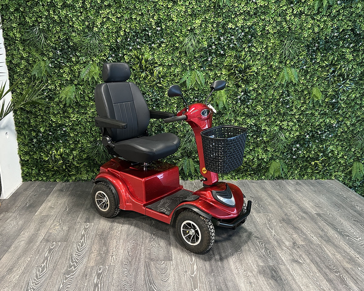 Rød 4-hjulet scooter udstyret med kurv, så du nemt kan have ekstra bagage med på turen. Denne scooter er især god til bykørsel eller små ture ude i det fri. Scooteren er udstyret med et komfortabelt sæde, så du sidder godt og behageligt på turen.