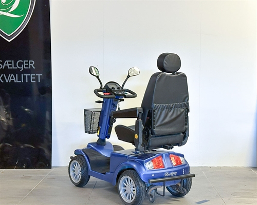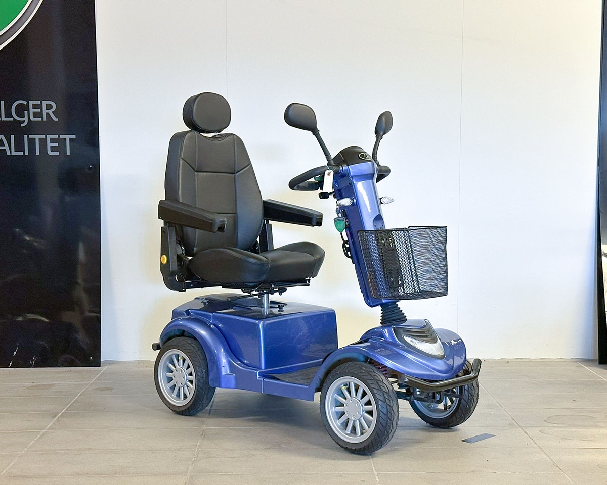 Brugt blå 4-hjulet scooter udstyret med forkurv og luksus-sæde. Sædet er udstyret med justerbare armlæn og nakkestøtte, samt ekstra god polstring i sæde og ryg. Scooteren er solid og god til både de korte og de lange ture.