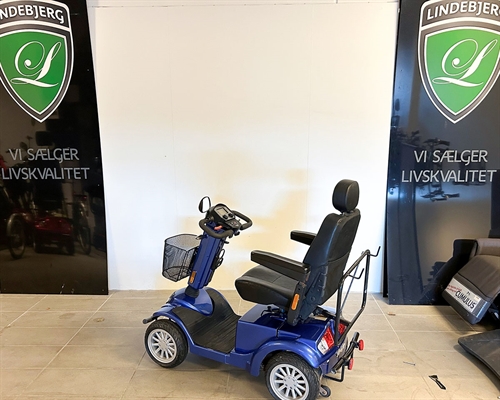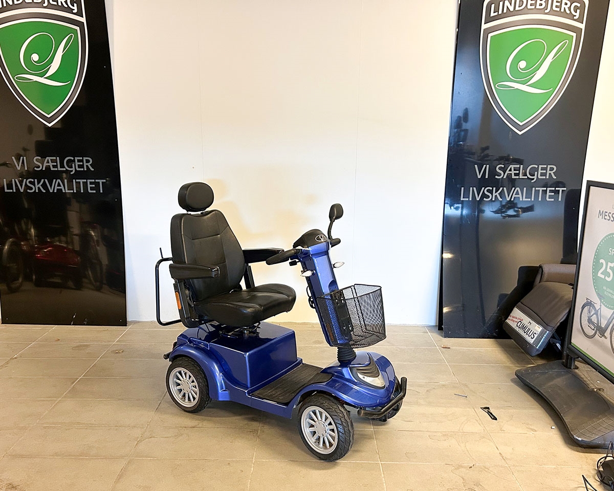 Brugt blå 4-hjulet scooter udstyret med forkurv og luksus-sæde. Sædet er udstyret med justerbare armlæn og nakkestøtte, samt ekstra god polstring i sæde og ryg. Scooteren er solid og god til både de korte og de lange ture.