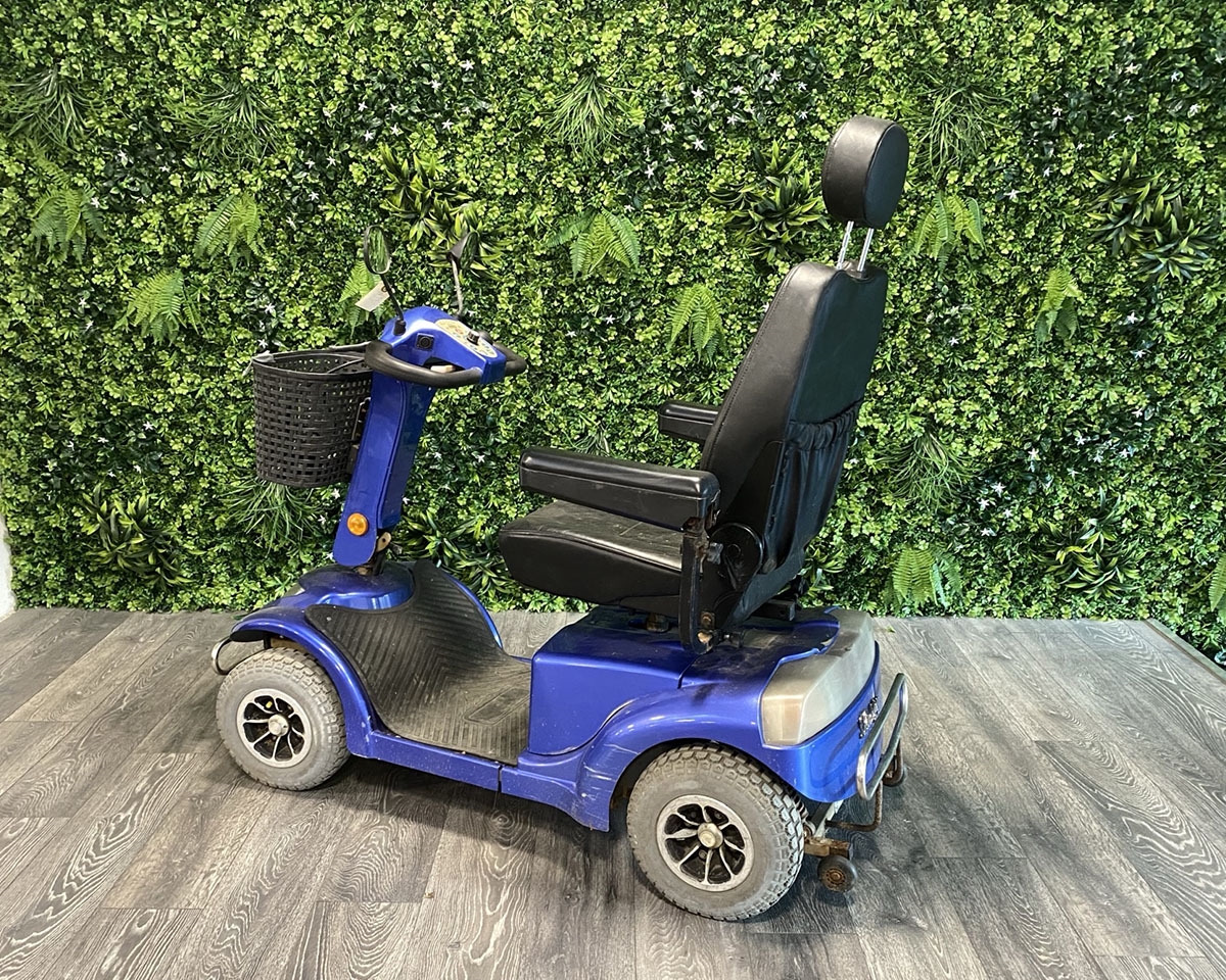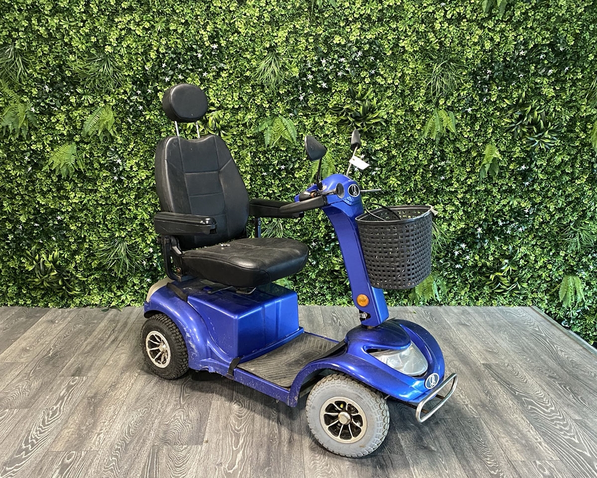 Brugt blå 4-hjulet scooter udstyret med forkurv. Scooteren fragter dig nemt fra A til B og er god til både de korte og længere ture.