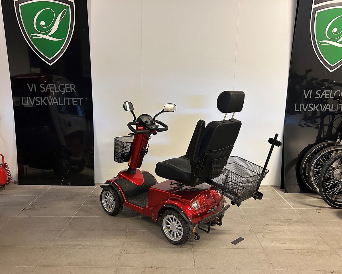 Solid og komfortabel el-scooter med 4 hjul og i en smart rød farve. Den ekstra kraftige motor gør det muligt at forcere selv vanskeligt terræn ude i naturen. Sædet på scooteren er udstyret med justerbare armlæn og nakkestøtte. Scooteren er desuden udstyret med et smart og brugervenligt digitalt display og en forkurv til ekstra bagage.