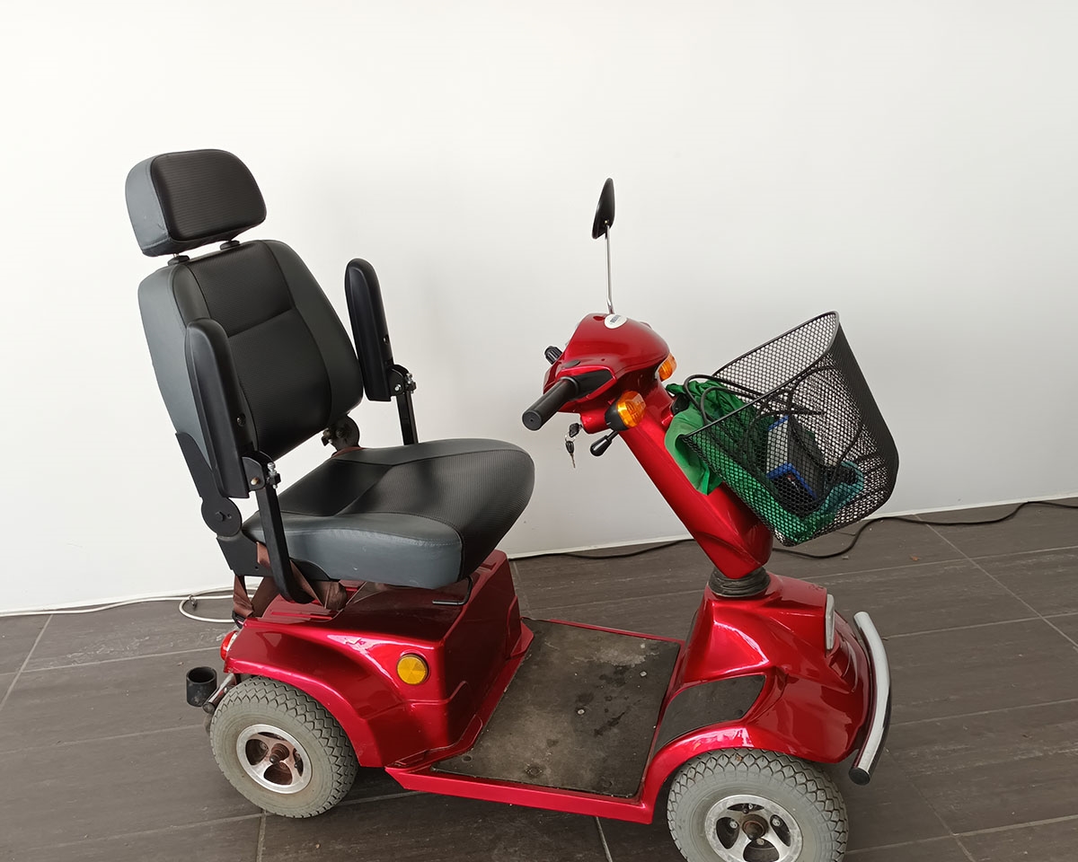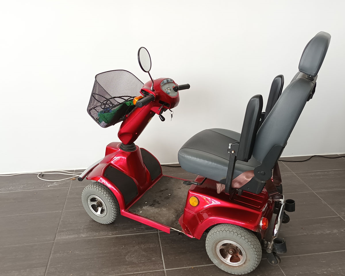 Rød 4-hjulet el-scooter udstyret med forkurv og luksus-sæde - dog med nogle brugsspor. Sædet er udstyret med justerbare armlæn og nakkestøtte, samt ekstra god polstring i sæde og ryg. Scooteren er solid og god til både de korte og de lange ture.