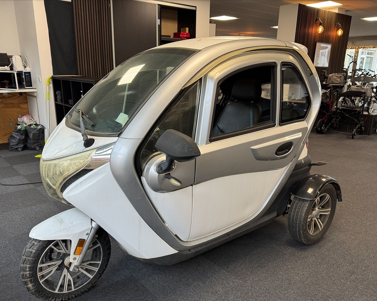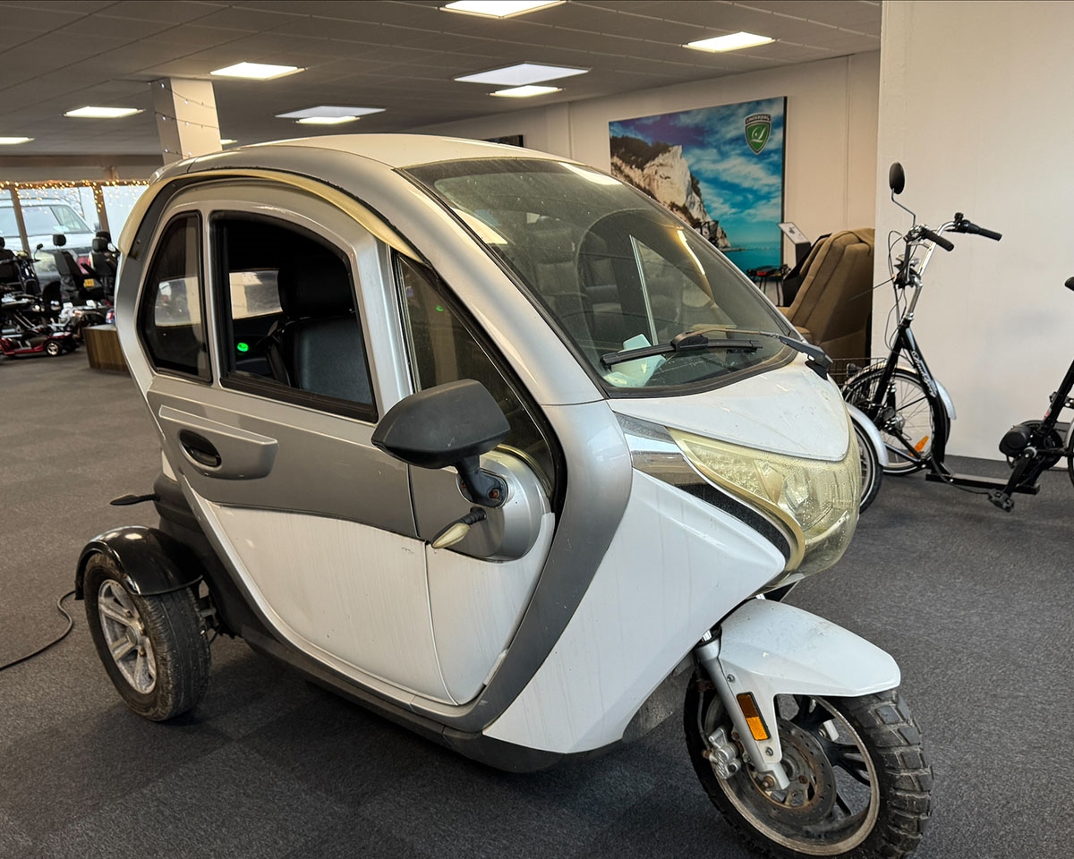 Velkørende Lindebjerg kabinescooter. Scooteren er let betjenelig og meget komfortabel. Køretøjet er meget pålideligt og kan med den kraftige motor forcere selv svært terræn og diverse bakker. Med en kabinescooter slipper du for at tænke på upålideligt vejr, når du vil ud og køre. Her sidder du trygt og tørt.