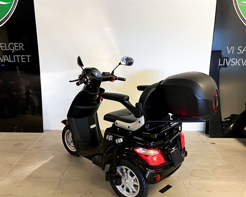Bliv godt kørende med denne brugte 3-hjulet VGA Tres el-scooter. Scooteren er ideel som langturskøretøj og desuden med et komfortabelt sæde. Scooteren har hydrauliske skivebremser foran og tromlebremse bagved samt støddæmpning for og bag, som giver en god køreoplevelse. Ønsker du nedsat hastighed, kan topfarten ændres til max 15 km/t.