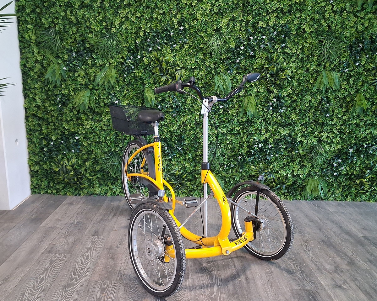 Brugt 3-hjulet cykel i en fin hul farve. Cyklen er med 2 forhjul, hvilket gør den mere stabil på forhjulene, så du nemt kan komme omkring og med høj stabilitet. Cyklen er inklusiv en lille bagkurv til diverse bagage.